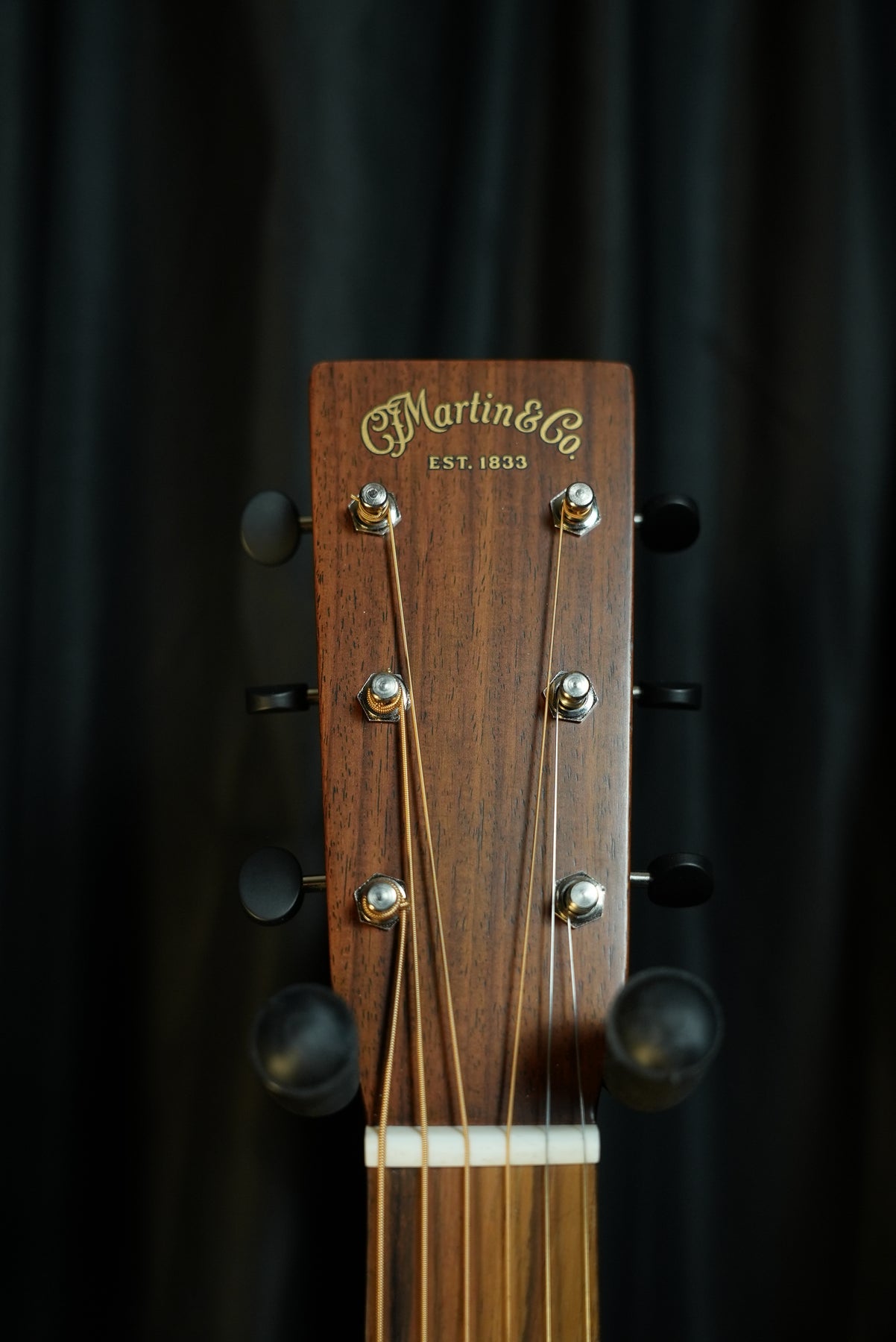 Close-up of Martin D-15M headstock with Martin decal and nickel open-gear tuners with butterbean knobs