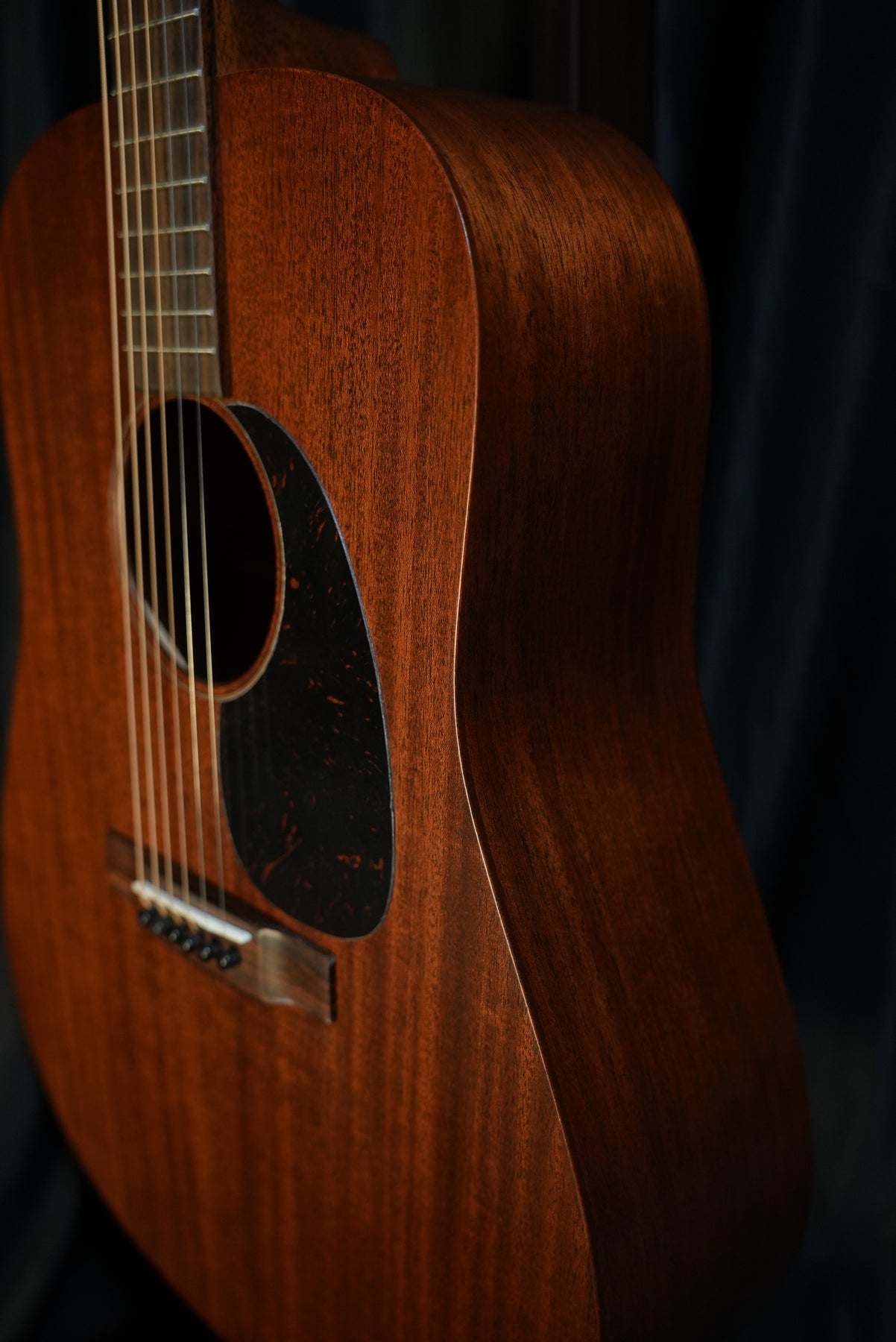 Side profile of Martin D-15M dreadnought body, highlighting mahogany sides and body depth