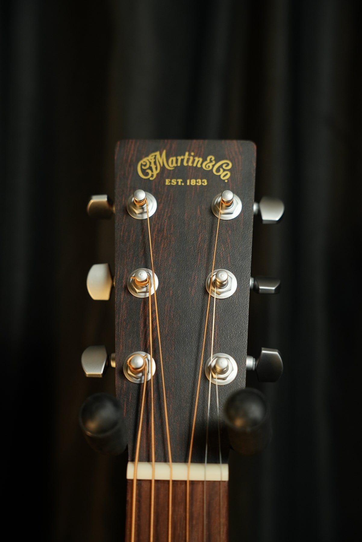 Close-up of Martin 000-X2E headstock with Martin decal logo and satin-chrome closed-gear tuning machines
