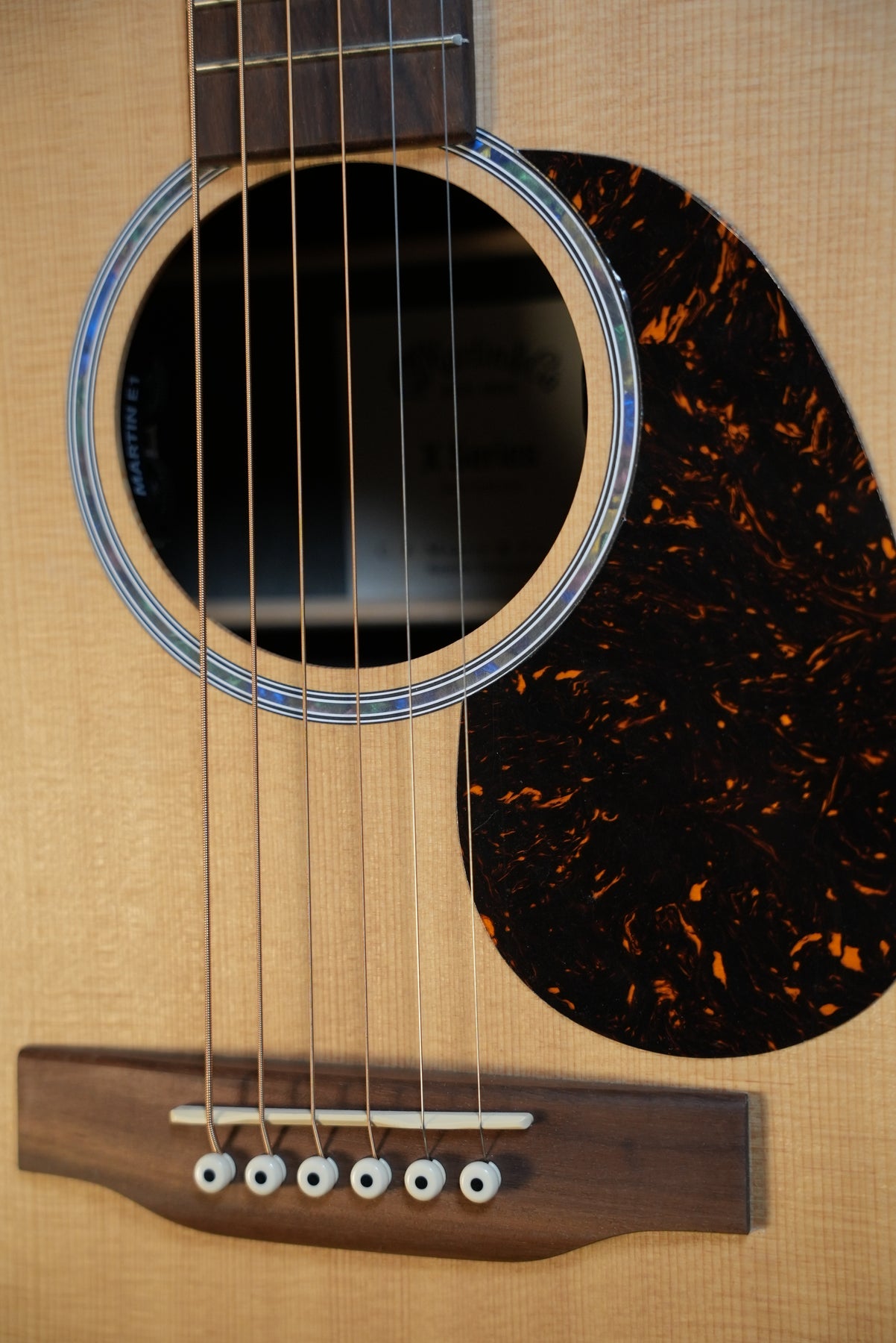 Detail shot of Martin 000-X2E soundhole showing spruce top and abalone-pattern single-ring rosette